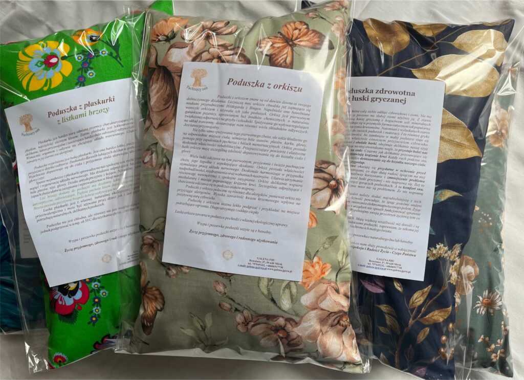 Dziś pragnę pokazać poduszki, które już są zapakowane i mają ulotkę informacyjną. Tak właśnie oprawiona poduszka trafia do paczki i jest wysyłana w podróż do Odbiorcy. Zatem jeśli ktoś martwi się o to, że np. jako prezent nie wygląda atrakcyjnie, to powiem: wygląda atrakcyjnie. Wystarczy ją tylko włożyć do torby prezentowej i wręczyć. Poza tym jeśli to jest poduszka zapachowa to subtelny zapach zostaje zatrzymany w celofanowym opakowaniu i otwierający czuje jej naturalny aromat. To też miłe doświadczenie. Tym bardziej, że wszystkie dodatki są naturalne czyli prosto z pól. Pachnąca lawenda, listki brzozy czy dębu, liść melisy czy szyszki chmielu. Natura zebrana w poduszce, ubrana w bawełnianą lub lnianą poszewkę i zapakowana w celofan idzie w świat do wybrańców, którzy pragną doświadczyć jej dobroczynnego działania. A tymczasem na polach dojrzewają tegoroczne zboża i zioła, i już niebawem będą wędrować do Was Drodzy Poduszkowcy